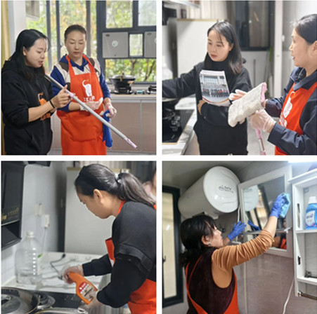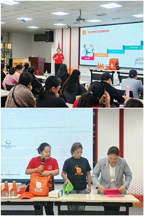 钱慧琴、蒋兰兰两位讲师则通过场景化教学,示范入户沟通话术、演练精细擦窗流程、规范六区清洁操作,传递可直接复用的实战经验。