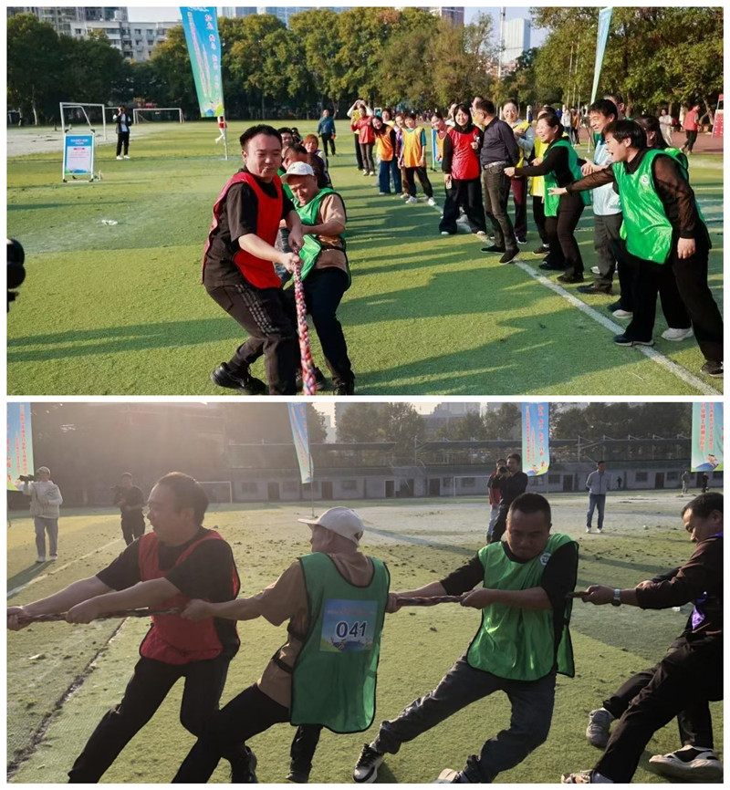 拔河比赛现场尤为激烈,队员们脚抵着脚、肩并着肩,迅速形成合力,啦啦队员齐声助威,呐喊声此起彼伏,大家紧紧拧成一股绳,全力以赴,赛出了健康、快乐,更展现了团结、和谐的精神。