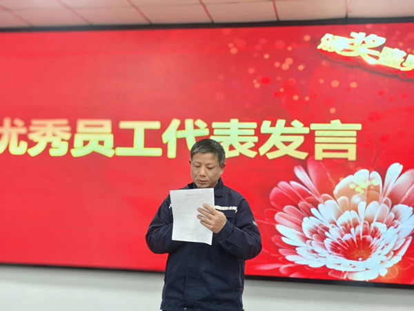 优秀员工代表刘信立登台分享了获奖感言,质朴的话语传递着对岗位的热爱与对江城清洗公司的感恩,也为在场同仁带来了奋进的力量。