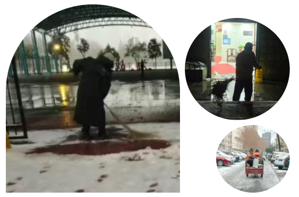 凛冽寒风中,保洁员们全力开展融雪除冰作业:手握铁锹凿开路面坚冰,手背冻得通红发紫仍浑然不觉;俯身铺设防滑垫,指尖冻僵依旧确保铺设平整;撒布融雪剂时精准控量、均匀投放,寒气侵入衣物却无暇取暖,争分夺秒推进作业。