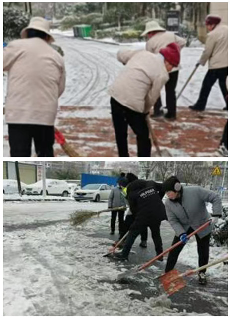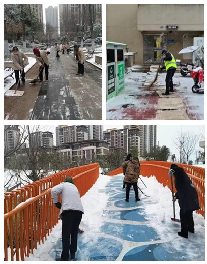 武汉江城清洗服务有限公司各项目作业现场秩序井然、分工明确、协作高效。在出入口、主干道、公共活动区域等人员流动密集的关键点位,保洁员们的身影穿梭在皑皑白雪间,以“快、准、净”为标准,全力推进清雪除冰工作。作业中,他们顶风冒雪、坚守岗位,弯腰挥帚扫雪、躬身铲冰除障,每一个动作都坚定有力。针对业主出行的必经区域,开展逐区清理、逐点排查工作,全方位消除积雪隐患,做到不留任何死角。以坚守岗位的担当筑牢冬季安全防线,全力保障业主安全出行以及正常的生产生活秩序。